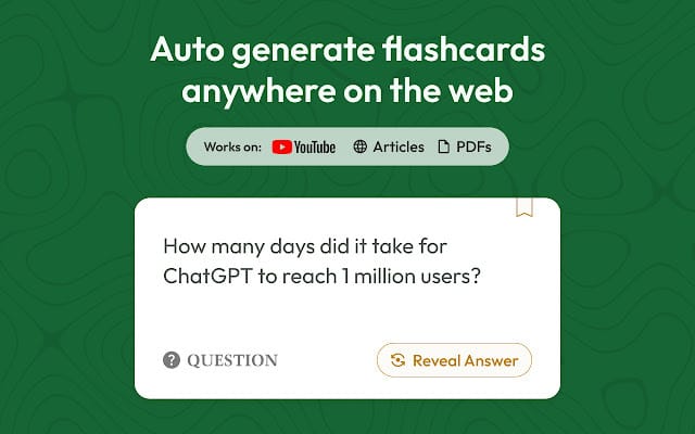 Automatically generate flashcards from any article, PDF, or YouTube video to improve retention, using AI.