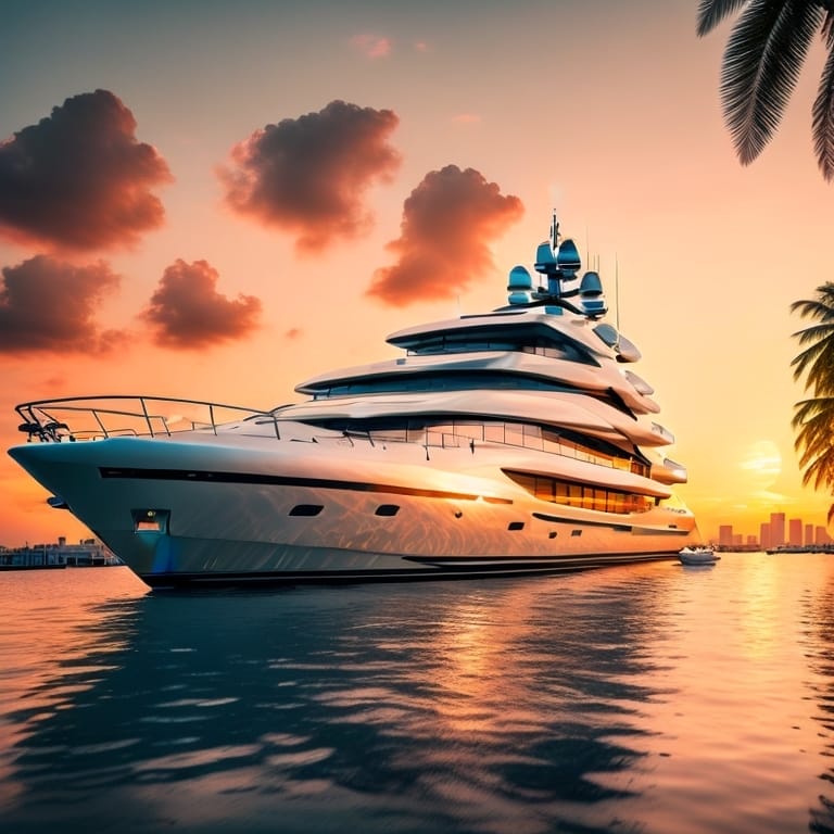 beautiful yacht, at marina in miami, beautiful futuristic, sunset, 8k