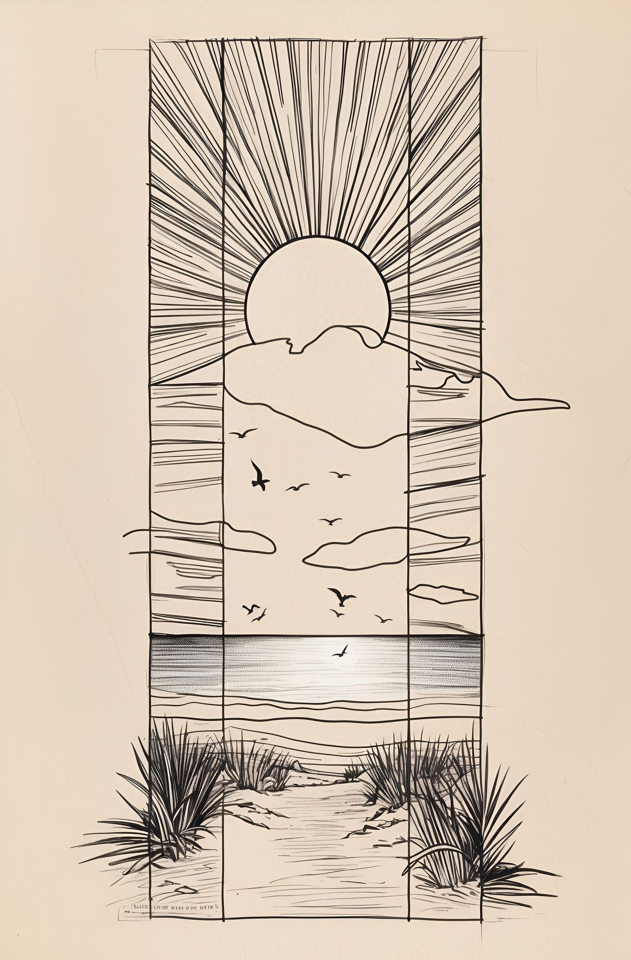 PROMPT: a masterpiece interpretative rough pencil sketch of A vertical line art illustration depicting a majestic sunshine on a serene and peaceful beach with only a few birds flying in the distance, filling the entire space without any borders or frames. The detailed features of the scenery and the vibrant environment are outlined in clear, black-and-white lines, creating a crisp image waiting to be colored, with visible pencil marks and paper texture.