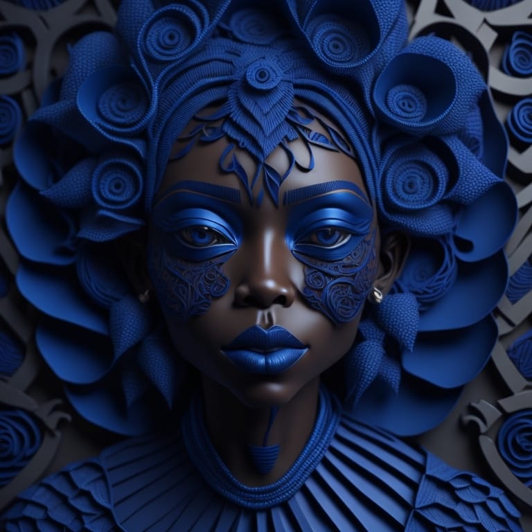 Vermilon FRACTAL. Paper Quilling, black nubian queen Head and shoulders portrait. Vietnamese Lady. Hyperrealistic craft, paper sculpture Interdimensional. Perfect eyes. Zentangle ornate background, blue hue glow.