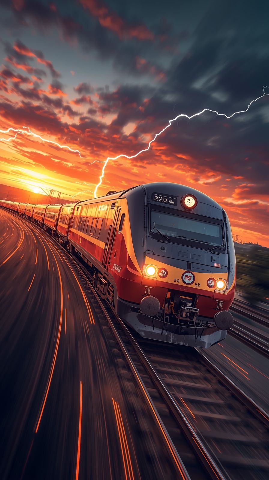 PROMPT: cinematic YouTube thumbnail of Vande Bharat Express train racing at extreme speed, long train with 15 coaches visible, dramatic sunset sky with lightning, fire sparks on railway track, motion blur speed lines, futuristic speedometer showing 220+ km/h, ultra detailed, vibrant colors, high contrast, glowing effects, dramatic perspective, railway curve aerial view, professional YouTube thumbnail style, 16:9