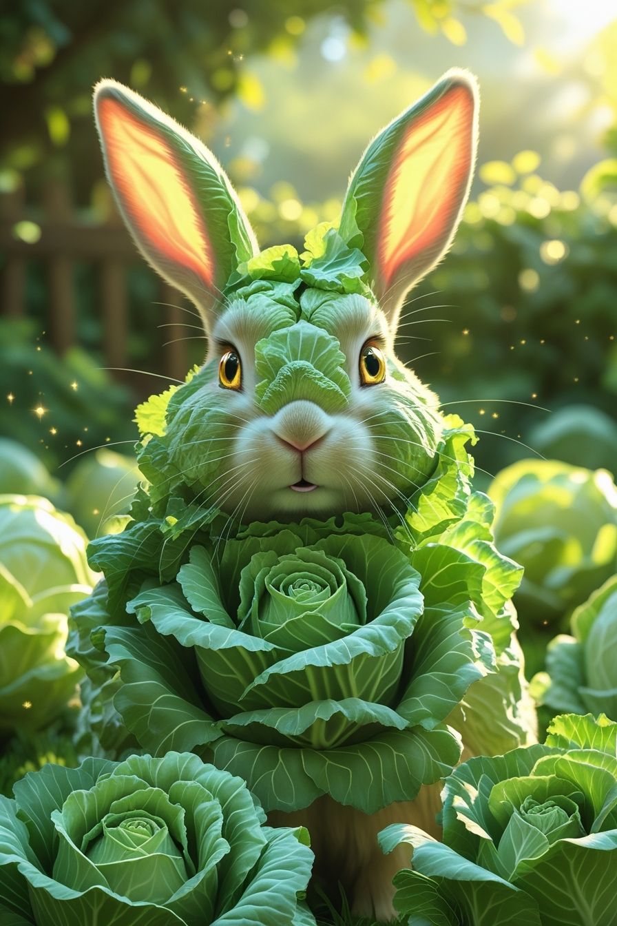 PROMPT: A magical rabbit whose entire body has transformed into the texture and color of a green cabbage. Its fur is replaced by delicate, layered cabbage leaves, with its long ears resembling curled cabbage edges. Its bright, golden eyes remain expressive, full of curiosity and joy, set against a dreamy garden background bathed in warm sunlight.