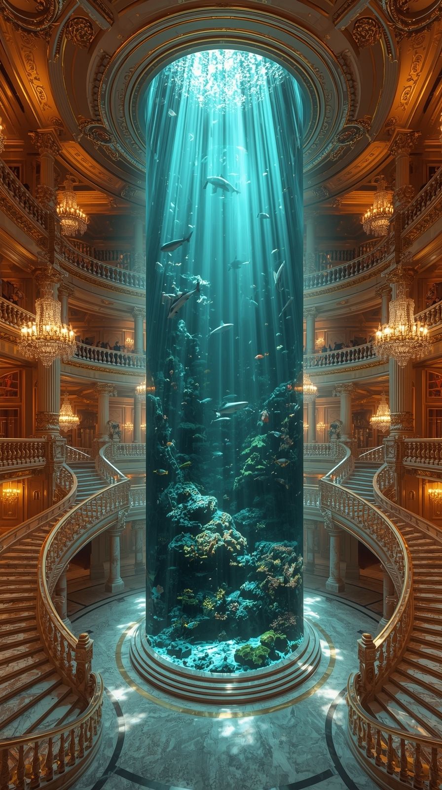 Surrounding the aquarium are spiraling marble staircases with gold railings, leading up to multiple balconies and terraces. The interior design blends baroque and neoclassical elements — ornate columns, gilded moldings, and crystal chandeliers suspended from high, domed ceilings.
