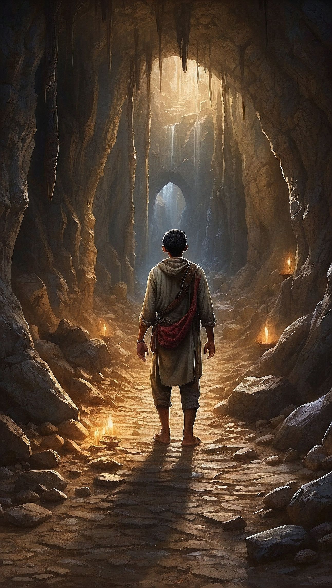 PROMPT: Realistic painting of Omar discovers a wide hall in the heart of the cave, and finds a huge treasure.