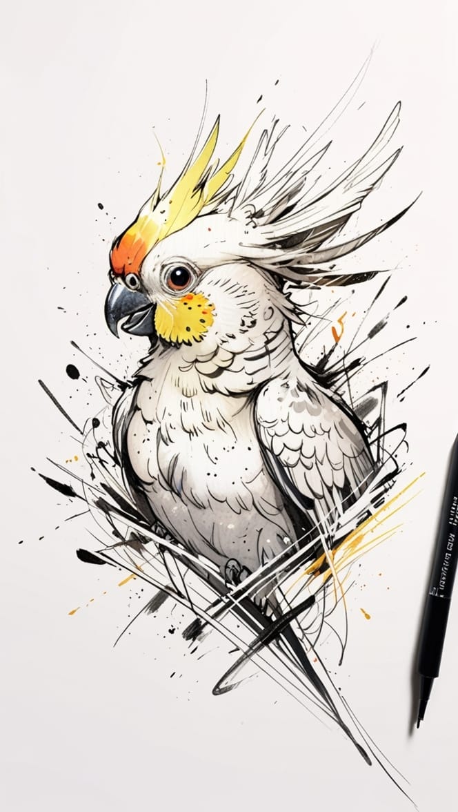 PROMPT: cockatiel paint running, watercolor splash, lines Random, sketch, lines, ink with crosshatch , bust ,white background, around lines random, sketch tattoo, lines random
