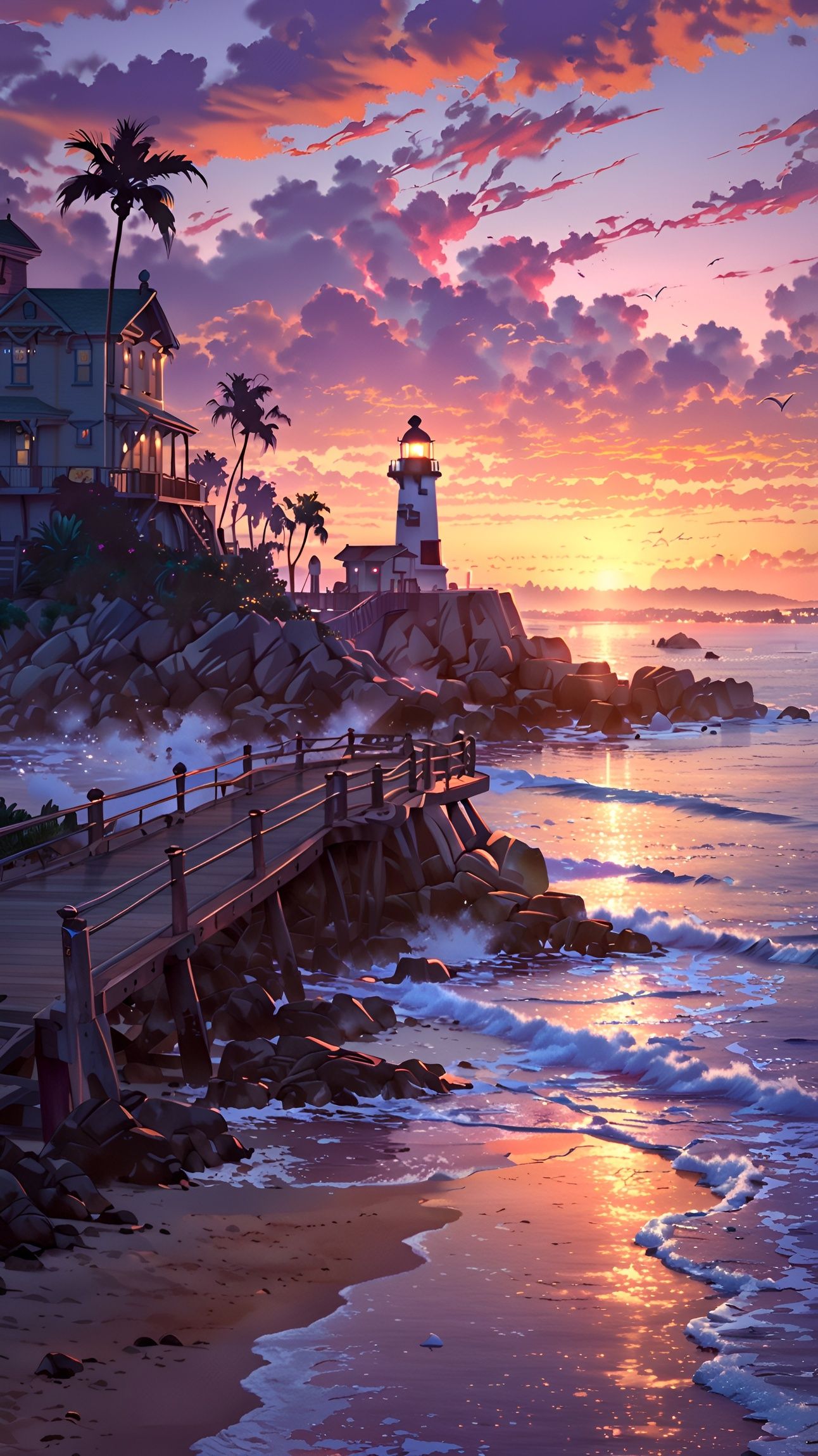 PROMPT: "An enchanting anime-style seaside cityscape at sunset, with a boardwalk overlooking a calm, glistening ocean. Vibrant shops and cafés line the waterfront, their warm lights contrasting beautifully with the cool tones of the water. Small boats are anchored nearby, their lanterns flickering softly. In the distance, a lighthouse stands on a rocky cliff, its beam shining through the gentle evening mist. Palm trees sway gently along the boardwalk, and the golden glow of the sun paints the waves in shimmering hues of orange, pink, and lavender. The atmosphere is tranquil yet full of life, blending realism with a magical touch."