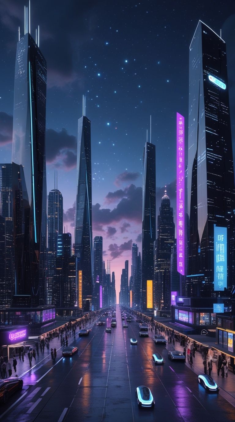 PROMPT: A futuristic metropolitan cityscape at dusk in the year 2100, set against a dark, starry night sky with sleek, angular skyscrapers and towering neon-lit skyscrapers that seem to stretch up to the clouds, their black glass and steel exteriors reflecting the vibrant hues of LED lights and holographic advertisements that dance across the city's bustling streets, where flyingcars and hyperloops zip by, and pedestrians of diverse skin tones and futuristic attire move through the crowded sidewalks, with subtle hints of cyberpunk elements and advanced technology seamlessly integrated into the urban infrastructure, all bathed in a deep, dark blue and purple color palette that evokes a sense of high-tech sophistication and innovation.