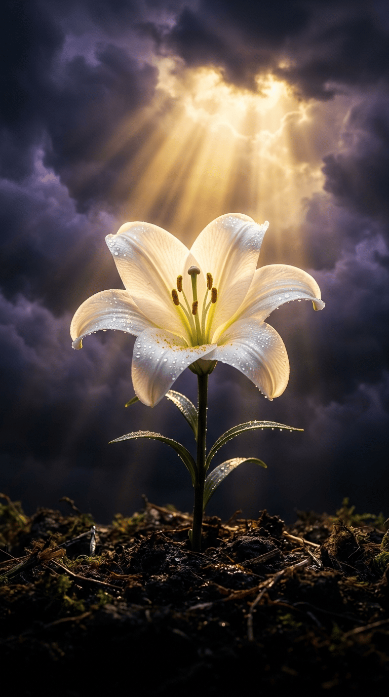 "prompt": "Ultra-detailed hyper-realistic portrait of a single white Easter lily in full bloom, emerging from dark rich soil, bathed in dramatic golden god-ray light breaking through deep violet and indigo storm clouds above. Each petal rendered with extraordinary detail — translucent, glowing from within with warm ethereal light. Tiny dewdrops catch the light like diamonds. The background fades into deep darkness below and celestial gold above, creating a powerful contrast between death and resurrection. The composition is vertical, intimate, and deeply spiritual. Cinematic lighting, volumetric rays, 8K resolution, masterpiece, award-winning nature photography style.",