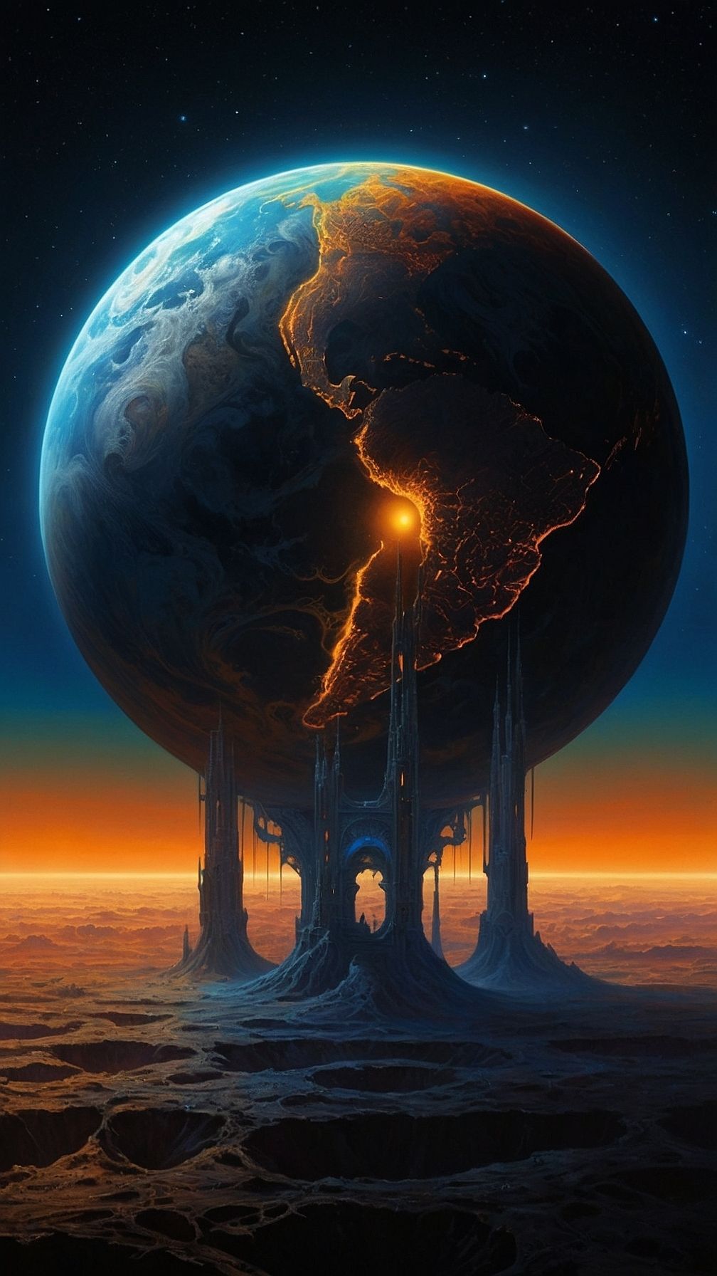 PROMPT: Subject: Earth, Moon, and Sun in a syzygy, aligned amidst the vast cosmos, with a solar eclipse casting a sharp shadow on Earth.Style: Photorealism fused with gothic sci-fi and Baroque, drawing inspiration from Beksinski and Caravaggio. This approach emphasizes the ethereal vastness around the alignment, adorned with fractal patterns and cosmic colors.Details: Earth foregrounded as a delicate blue marble, shadowed subtly to highlight continents and oceans. The Moon, centered, casts a dark umbra on Earth, depicting the path of totality. The Sun, in radiant oranges and yellows, forms a stunning corona effect around the Moon.Composition: The celestial bodies are aligned against a backdrop of space, enriched with Beksinski-like surrealism and Caravaggio-inspired chiaroscuro, photorealistic, Depth of Field | Action Scene | Natural Lighting | Subject | Centered-shot | 22 Megapixels | Shot on IMAX 70mm | Detailed |Elegant | Perfection | Shimmering | Prespective, HDR, 8k, high resolution
