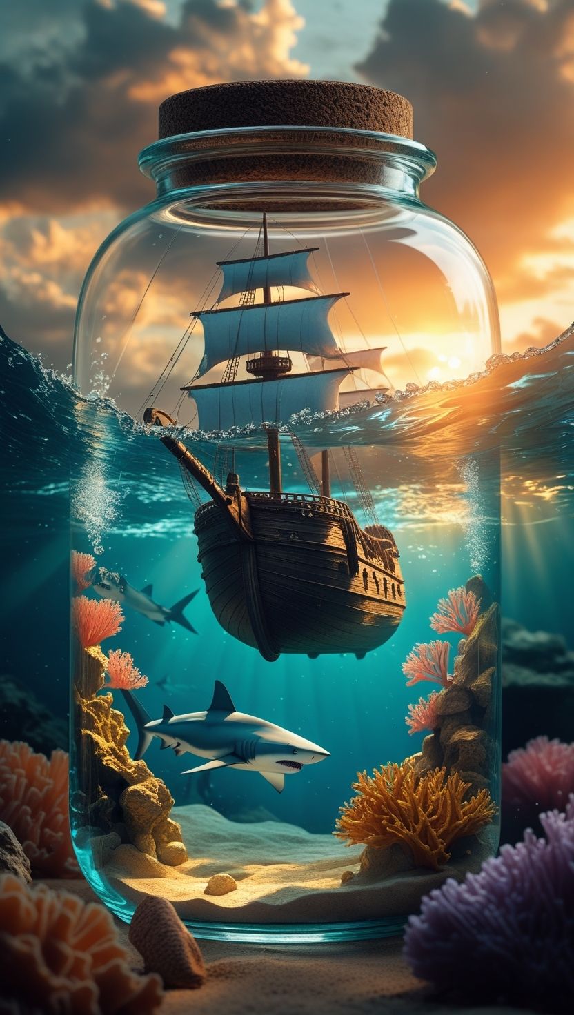 PROMPT: A cinematic ultra-realistic scene inside a large glass jar with a cork lid. An old wooden ship with white sails sails over a rough sea under a dramatic sky filled with dense clouds and golden sunset lighting. The camera captures the scene from a dynamic angle, with strong depth of field and realistic light reflections on the glass. Beneath the surface, a majestic shark swims among vibrant coral reefs, with light particles filtering through the crystal-clear water. The atmosphere is epic and magical, with warm and cool tones contrasting in a cinematic style. Ultra-realistic. Darkness image Ambient. Vivid and cinematic colors in high-contrast. Detailed, dramatic, and surreal image. The composition rendered and Enhance in incredible detail using 3D technology and Unreal Engine 5.5, PhotoReal, Flux Dev, Ray Traced, Upscale, DLSS4, FSR4, Anisotropic Filtering, Ultra Sharpness, Noiseless, High Fidelity. 4K UHD. (no words or numbers in prompt)