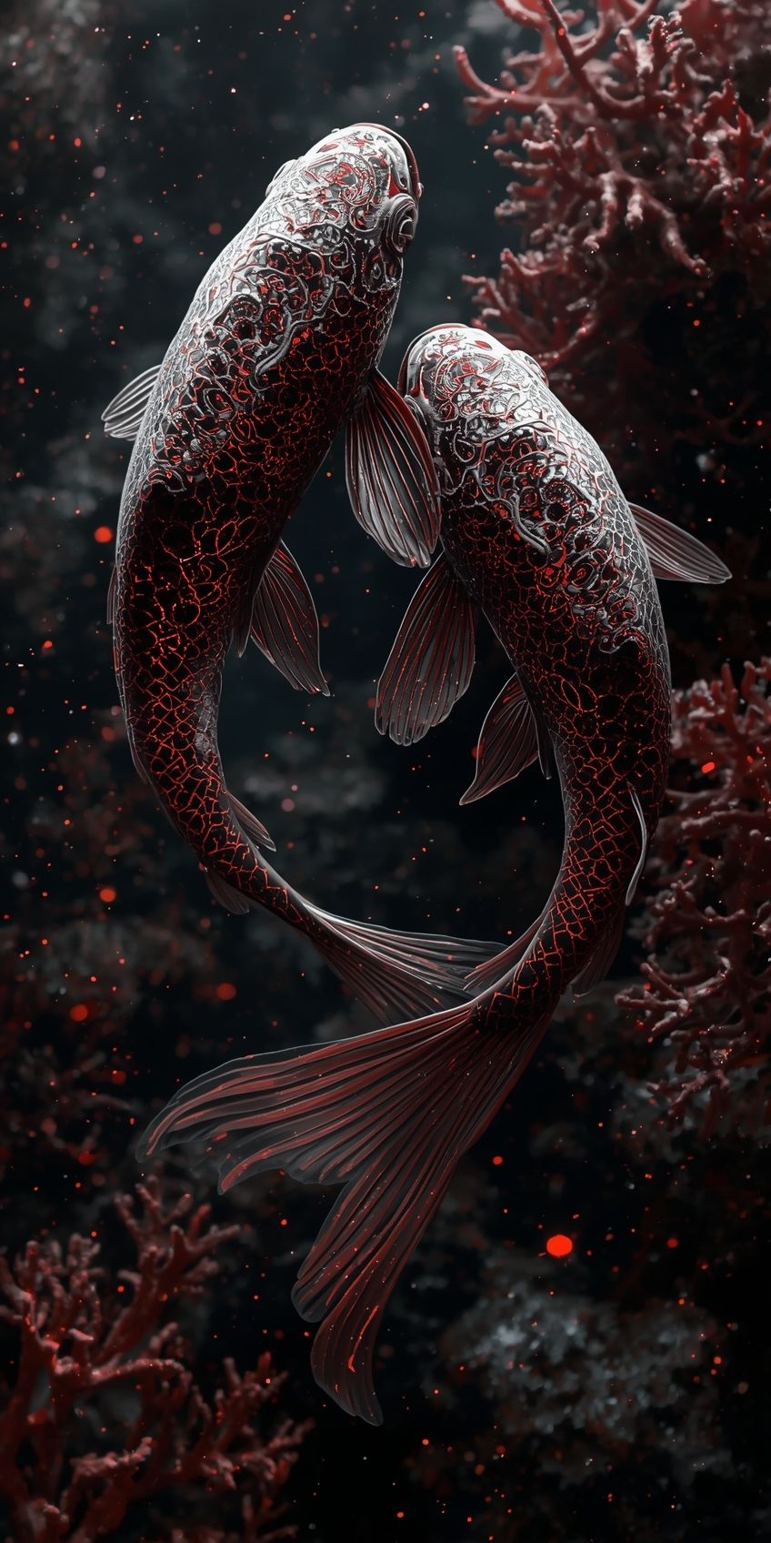 PROMPT: RAW photo, (Black, dark red, and glowing silver: Portrait of two ghostly long-tailed white koi, woman, shiny aura, highly detailed, red filigree, intricate motifs, organic tracery, in the style of Januz Miralles and Hikari Shimoda, glowing stardust inspired by W. Zelmer, perfect composition, smooth, sharp focus, sparkling particles, lively coral reef background. Realistic, realism, 35mm photography in HD and 8K), masterpiece, award-winning photography, natural light, perfect composition, high detail, hyper-realistic.