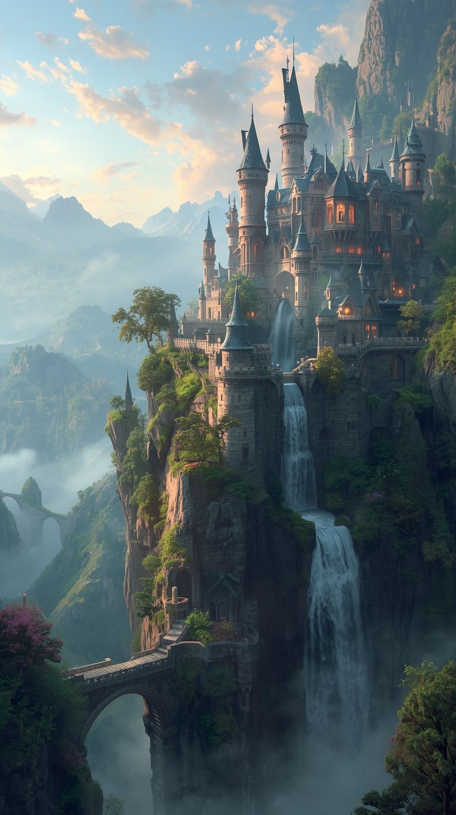 PROMPT: A majestic sprawling magical kingdom is perched on a rugged cliffside, with cascading waterfalls flowing gently around the ancient stone city walls, adorned with intricate carvings, as glowing lanterns in soft pastel hues illuminate the landscape, casting a warm ethereal glow, set against a backdrop of rolling misty mountains, with an epic scale, ultra-detailed, and photorealistic fantasy realism, featuring lush greenery, vibrant flora, and majestic trees, with a mesmerizing atmosphere, and breathtaking vistas, under a soft, serene sky with a few wispy clouds.