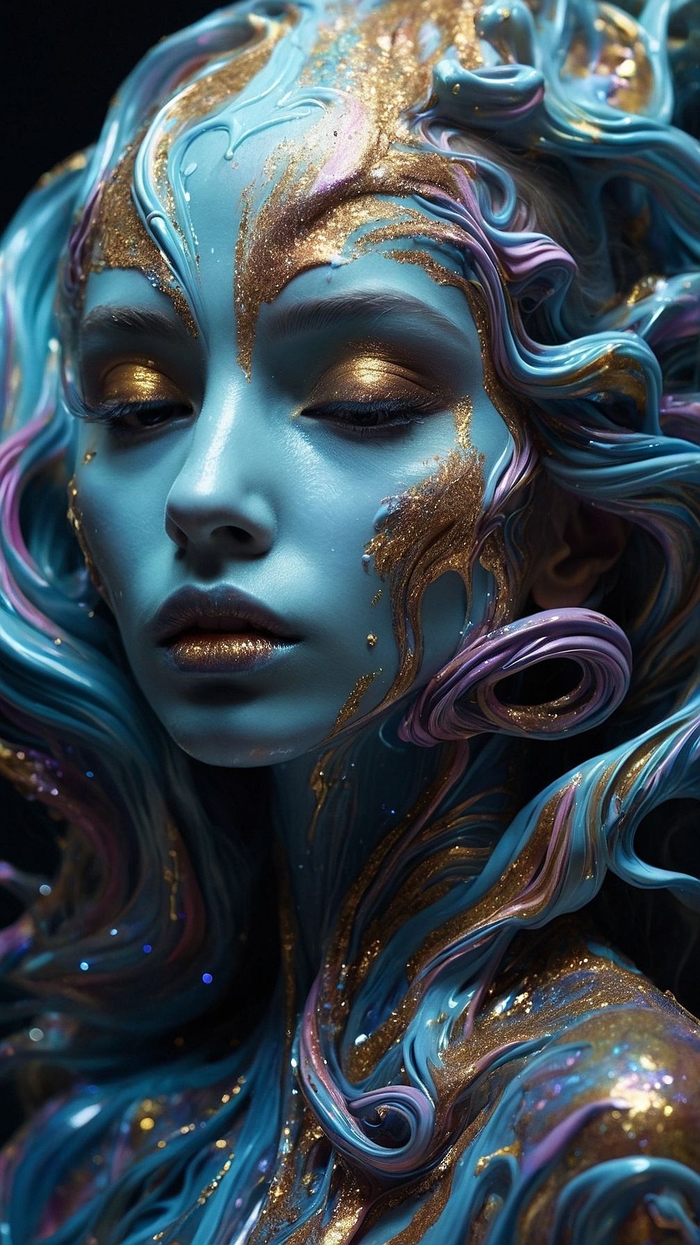 PROMPT: A mesmerizingly intricate Slime girl, each feature meticulously crafted with vibrant colors and surreal details: shimmering tendrils of slime flowing like liquid silk, iridescent patterns swirling across her skin, and eyes that seem to hold galaxies within. This breathtaking masterpiece of surrealism is a painting that exudes a sense of otherworldly beauty and meticulous attention to detail, captivating viewers with its high quality execution and dreamlike allure. full body