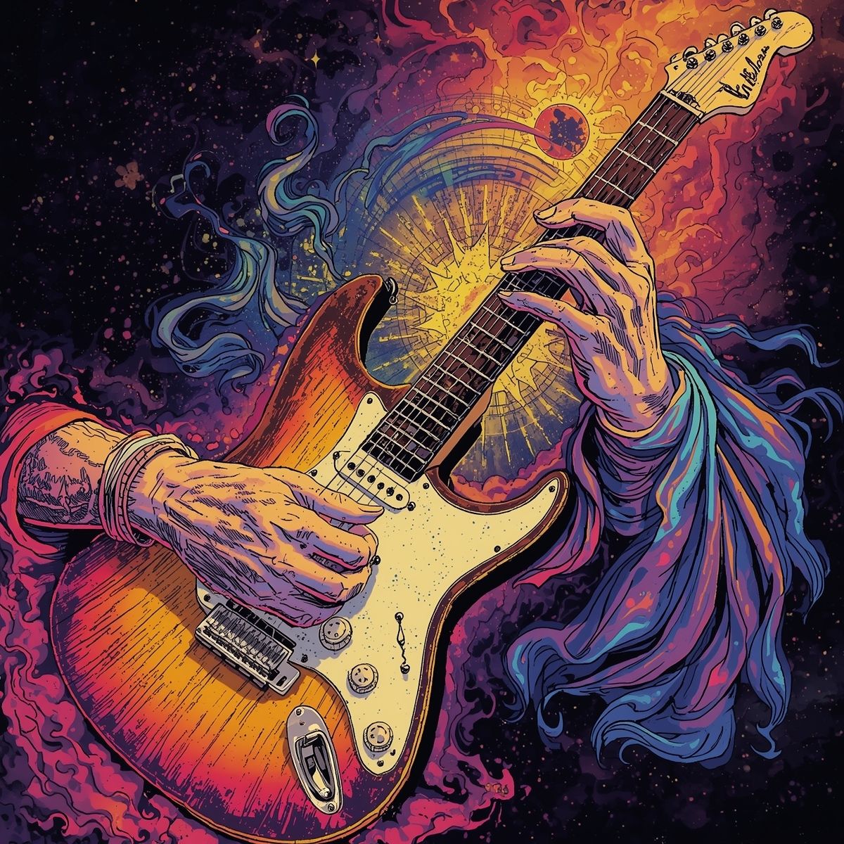 PROMPT: I want to create a a3 size image with a vibrant psychedelic drawing style, featuring a hollow body electric guitar with two hands of divine figure holding the guitar, the hands have to fade away till the elbows and also the fingers of the right hand I want them to have finger picks especially at the thumb and some how the universe with psychedelic colors, incorporating bold lines, dynamic shapes, and a mix of warm and cool hues to create a unique and captivating visual identity.