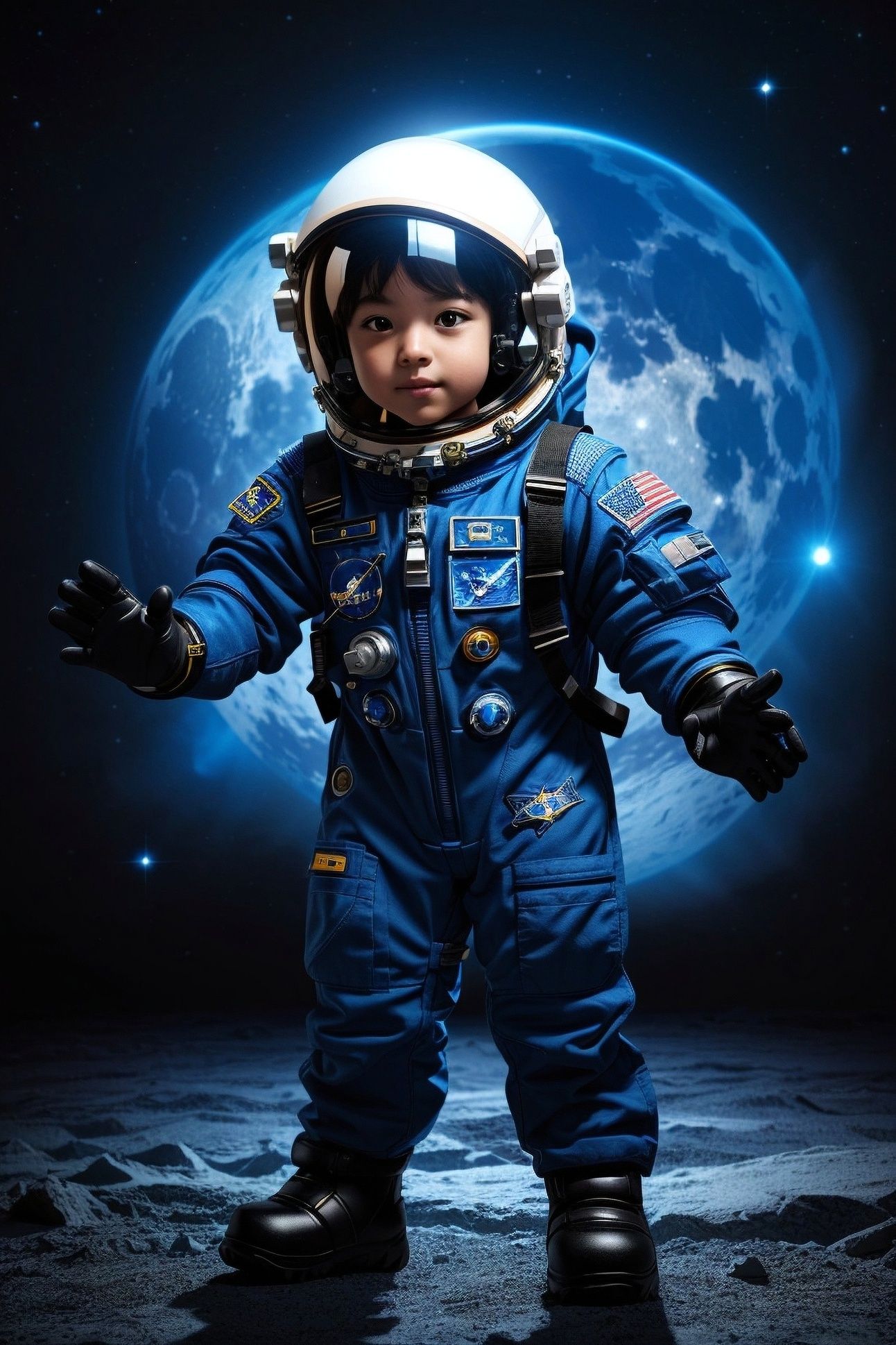 PROMPT: Create an artwork featuring a 7-9-year-old astronaut child wearing a blue spacesuit with a black visor and gloves. The child is standing in a dynamic pose, facing the viewer. The background is solid black, creating a high contrast. Dark moon boots. The lighting is bright and intense, illuminating the astronaut's figure. The overall mood is one of excitement and wonder, capturing the adventurous spirit of space exploration