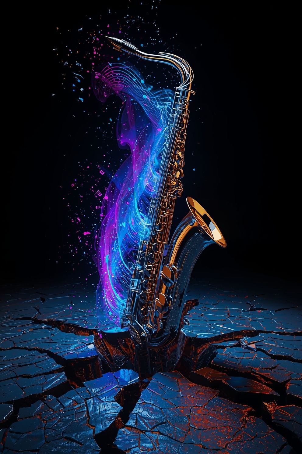 PROMPT: a cinematic photo of a futuristic 3D saxophone vibrating to the beat of a vibrant song with sound waves and musical notes emerging from the saxophone in a swirling pattern of bright blues and purples the ground appears to be breaking into fractured pieces with deep cracks and fissures as if the music is shattering the earth's surface the saxophone's metallic surface reflects shimmering lights and the sound waves are depicted in a mesmerizing Dance of light and color against a dark background with the saxophone as the central focal point of the image captured through high contrast photography.